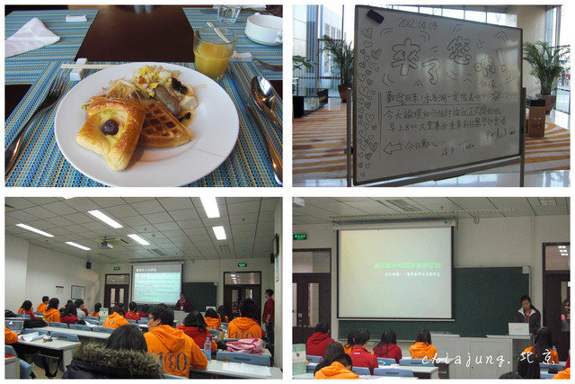 20120402到北京的第二天,交流活動的開幕式以及下午參觀北京大學,開幕式很正式,還印了一張開幕式議程表,各校的簡介都做得很精彩呀,然後有這次旅程唯一一次中國領導的喊話(但內容是什麼我已經忘了,而我當下偷看附近的人,大家似乎都不很認真啊),接下來老師的講題是《新世紀的醫學人才》,連老師的簡報都做得很精緻,我似乎有做筆記雖然一個上午下來聽到這有點想睡,於是開幕式就這樣給我簡單帶過了。